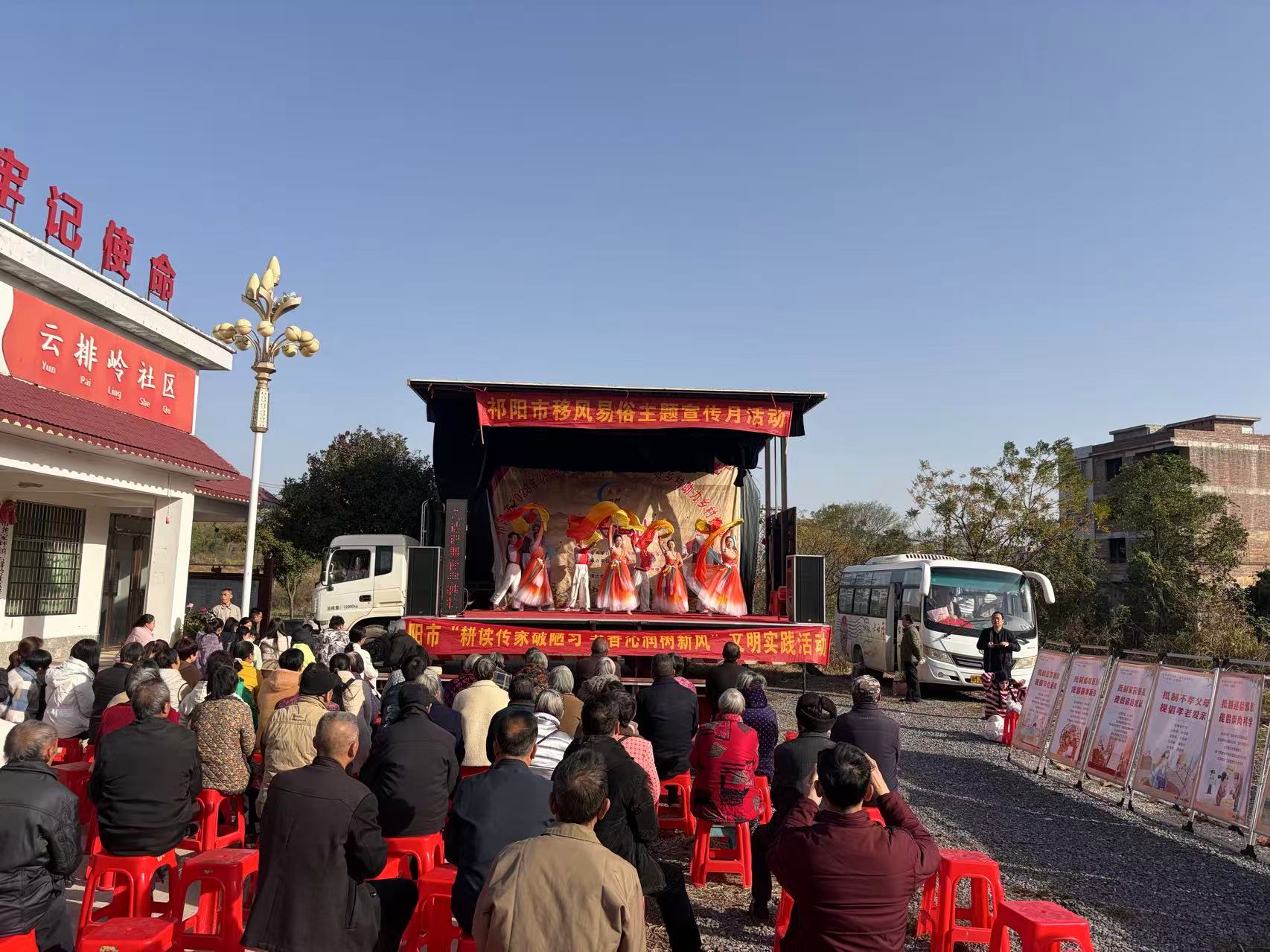 11月27日上午,龚家坪镇云排岭社区文化广场人头攒动,以“耕读传家破陋习 书香沁润树新风”为主题的文明实践活动暨祁阳市移风易俗主题宣传月活动在此拉开帷幕。本次活动由永州市祁阳祁剧团倾力演出,旨在通过群众喜闻乐见的形式,推动文明新风落地生根。
