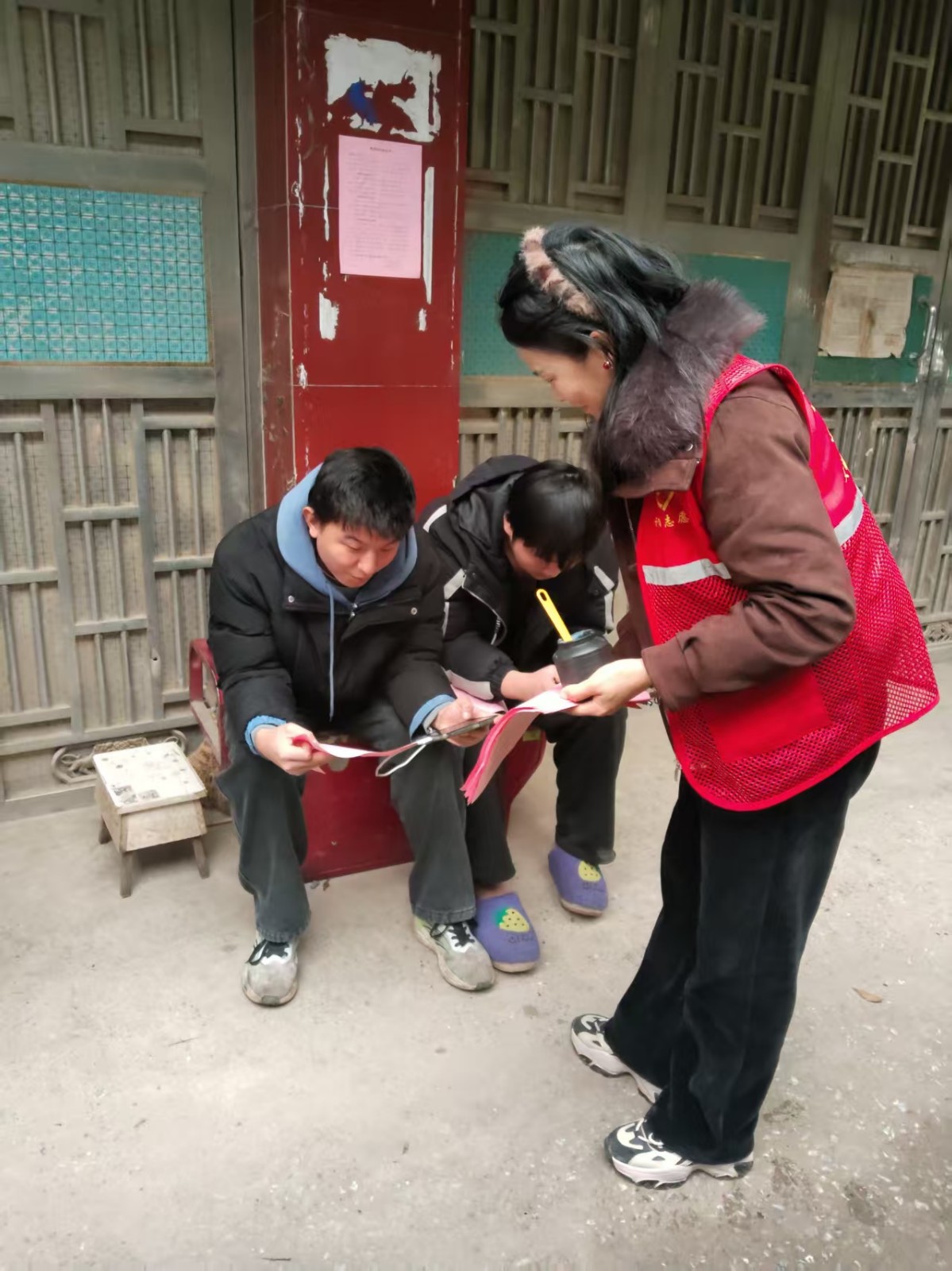 活动中,身着红马甲的志愿者队伍以社区网格为单位,分成4支小分队开展"敲门行动",挨家挨户发放《禁燃禁放倡议书》,面对面向居民讲解违规燃放的安全隐患与环境危害。针对老年群体,志愿者还特别用方言进行政策解读,确保宣传内容入脑入心。