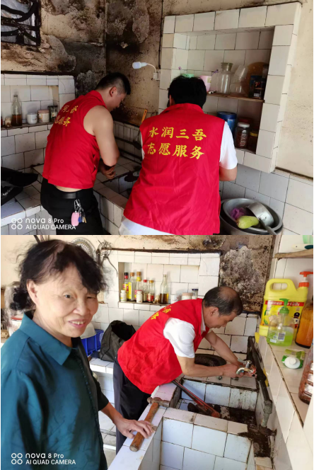 活动当天,志愿者们来到了寿安新村96号龙梅英家里,看到灶台锈迹斑斑的铁管,大家就开始忙碌着,有的拿钢锯、管钳拆卸室内生锈的老管,有的拿锤子、钢錾打孔,有的去买水管、配件。经过近两个小时的劳作,自来水管道全部更换成崭新PPR管。